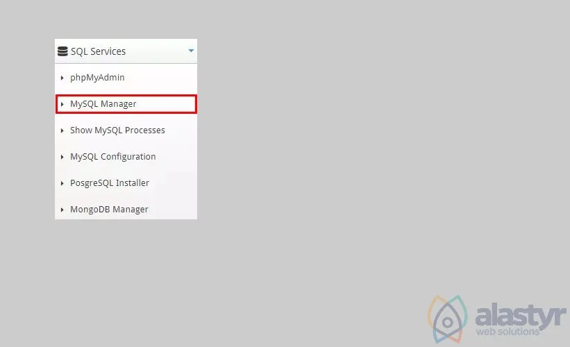 CentOS Web Panele giriş yaptıktan sonra sol menüde bulunan SQL Services sekmesi altındaki MySQL Manager bağlantısına tıklayarak yeni veritabanı ve veritabanı kullanıcısı oluşturabileceğiniz sayfaya giriş yapın. Açılan sayfada bulunan Create Database and User bağlantısına tıklayın.