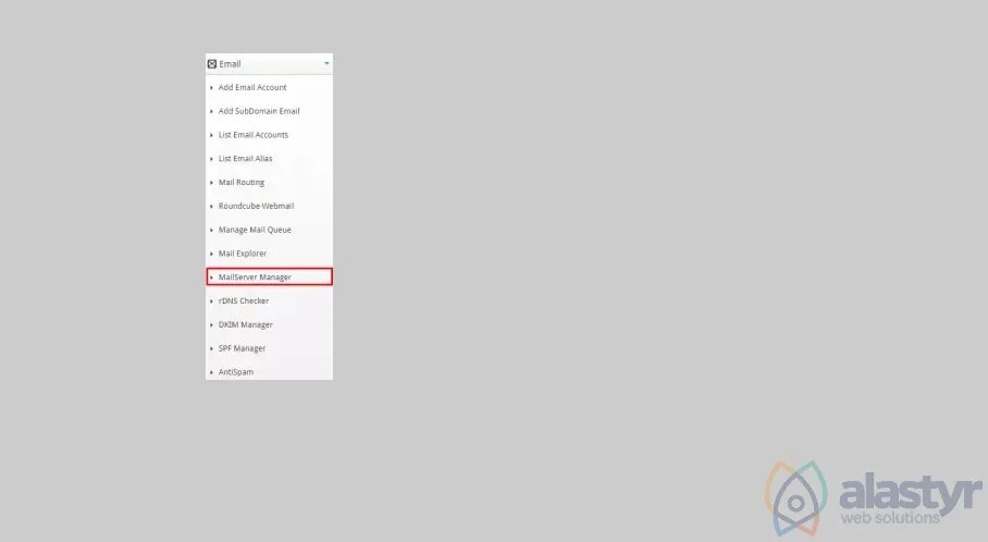 CentOS Web Panel’e giriş yaptıktan sonra sol menüde bulunan Email menüsü altındaki MailServer Manager bağlantısına tıklayarak sayfaya giriş yapın.