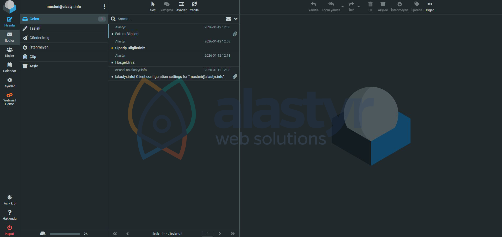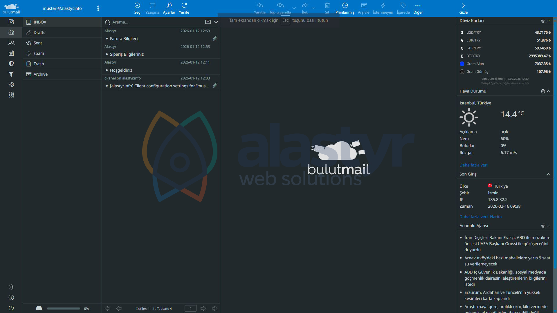 Bulut Mail, Alastyr altyapısında barındırılan webmail sistemidir. Modern ve kullanıcı dostu arayüzü sayesinde e-posta işlemleri hızlı ve pratik şekilde gerçekleştirilebilir.